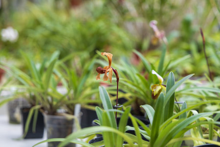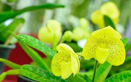 Lady slipper orchid or paphiopedilum orchid in the botanical garden.