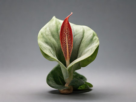 Red anthurium flower, bud copy space for text. Buying houseplants and flowers for home gardening.