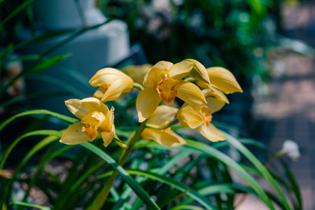 Bunch of yellow Cymbidium or Boat Orchid. Yellow orchid flowers. High quality photo
