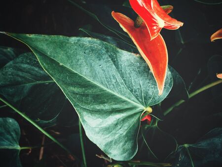 Red anthurium flower with green leaves in the garden, vintage tone