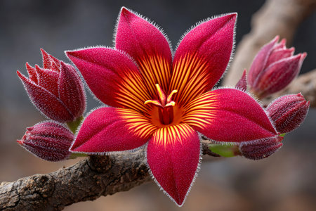 Red illawarra flame tree flower with fuzzy buds on a branch