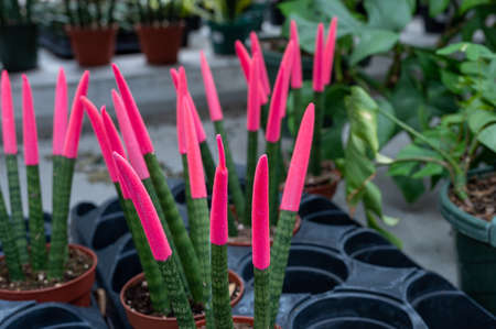 Various fresh cactus in the farm. A collection of cacti flourishing. Cactus plant in the arboretum. Industrial cactus farm in greenhouse with different types of cacti and succulents grown for sale.