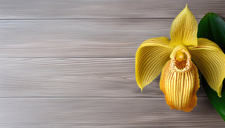 Yellow orchid on wooden background. Top view with copy space.
