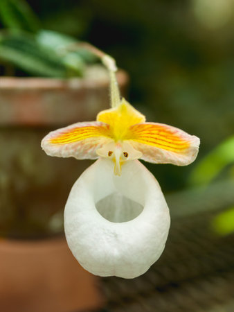 Close up photo of blooming Paphiopedilum micranthum. Beautiful orchid with white and yellow petals.