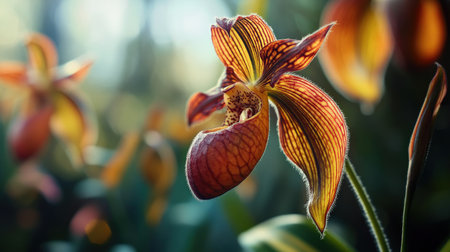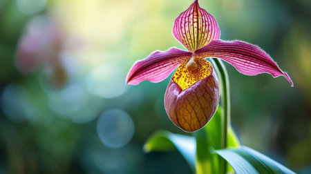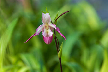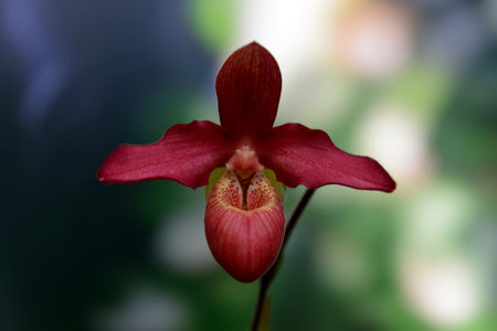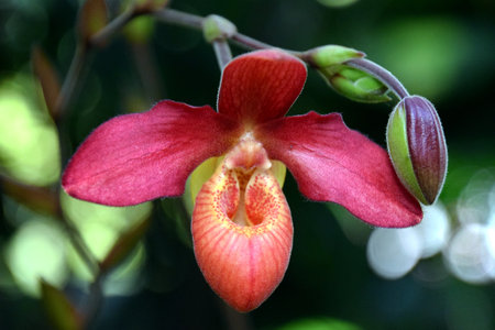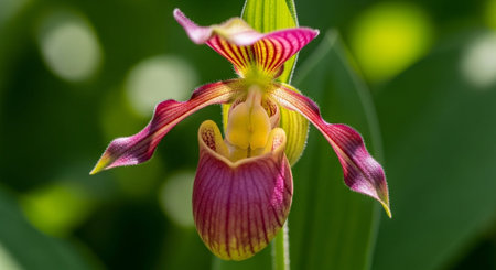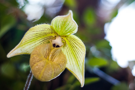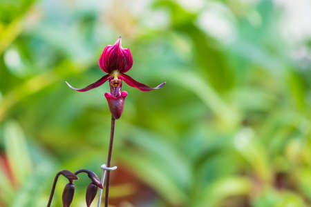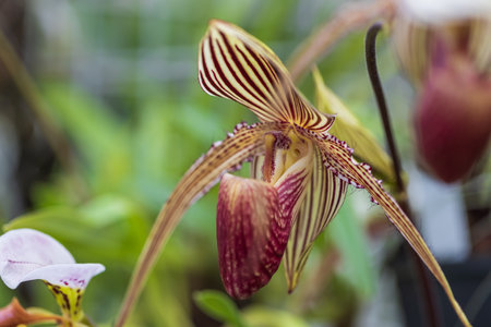 Blooming Paphiopedilum gratrixianum, Lady's Slipper Orchid Flower on Blurred Greenery Natural Background
