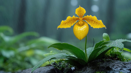 Vibrant yellow lady's slipper orchid getting wet in the rain, with lush green foliage in the background