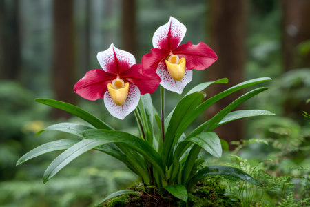 Lady slipper orchids blooming with red and white petals in a vibrant green tropical environment