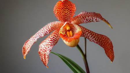 Stunning close-up of a vibrant orchid flower, showcasing intricate patterns and bright orange hues. Perfect for nature lovers and floral enthusiasts.