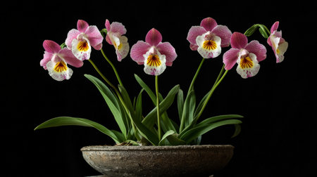 A delicate Miltonia orchid, also known as the Pansy Orchid, with its colorful and flat faced flowers