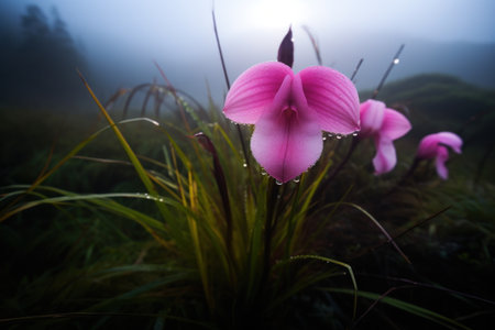 Delicate orchid blossom displays vibrant pink hues against a dark backdrop in a natural setting