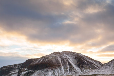 Snowy Icelandic mountains with dramatic cloudy sky - amazingly peaceful landscape of Iceland.