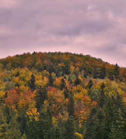 The mountain with a pine forest under the cloudy sky
