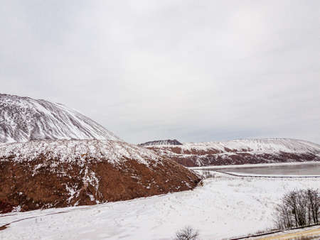 A waste heap or waste heap is a dump, an artificial embankment made of waste rock extracted during underground mining of mineral deposits. Winter landscape. Belarus. Soligorsk. Potassium salt