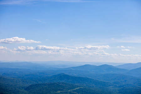 Blue hills in the distance. Landscapes of mountain Shoria. Kemerovo region, Kuzbass, Russia