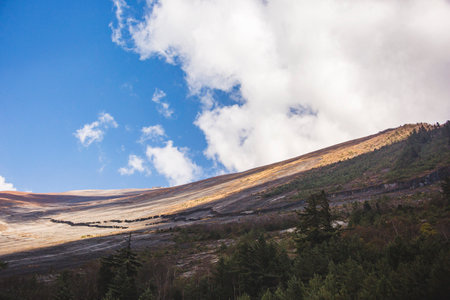 The texture of mountains hills of gravel against the background of the blue sky and clouds