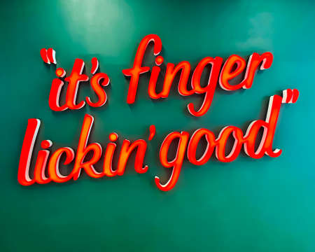 LATVIA, RIGA, JUNE, 2022: Promotional emblem near fast food cafe. Inexpensive quality food. Attracting buyers and design element for advertising