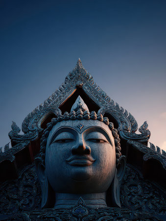 The photo showcases a stunning Buddha sculpture against a twilight sky, emphasizing intricate architectural details and evoking a sense of peace and spirituality.