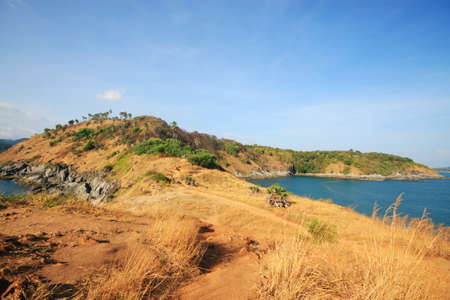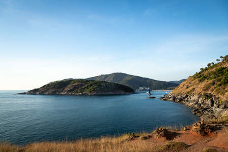 Beautiful seascape with sky twilight of sunset and sea horizon with Calm and blue sky.Dry grass field on mountain of Phrom Thep Cape is famous place in Phuket island, Thailand.