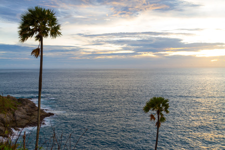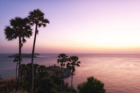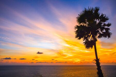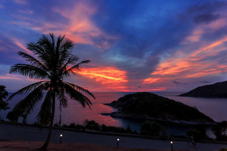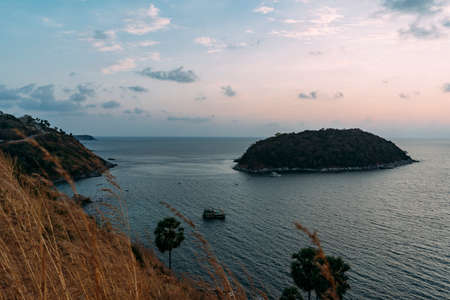 Beautiful seascape with sky twilight of sunset and Palm tree with Dry grass field on mountain of Phrom Thep Cape in Phuket island, Thailand.