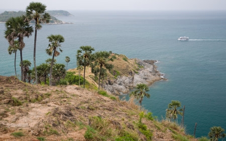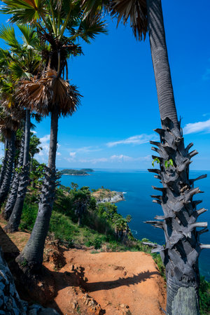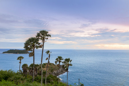 Palm trees in Promthep Cape with the Andaman Sea and islands in the distance during a cloudy day. In Phuket, Thailand