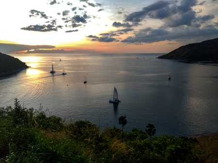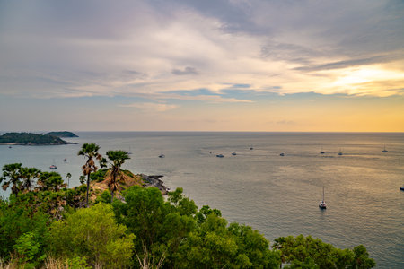 Beautiful sunset over the sea with sailboats in the foreground, the view from Windmill Viewpoint in Phuket, Thailand