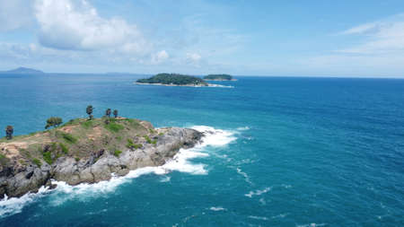 Amazing landscape nature scenery view of Beautiful tropical sea with Sea coast view in summer season image by Aerial view drone top down, high angle view Located at Laem Promthep Phuket Thailand.