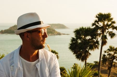 Young traveler man at summer holiday vacation with beautiful mountains and seascapes at background