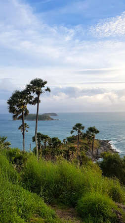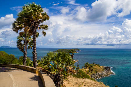 Beautiful landscape of the Promthep Cape, with palm trees and the Andaman sea in a cloudy day. With copy space.