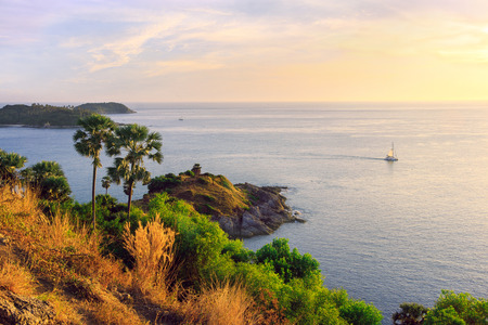 Phromthep Cape at the sunset, picturesque Andaman sea view in Phuket island, Thailand. Seascape with cliff and green palm trees against orange sky and lonely sailboat floating away into the distance.