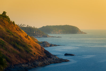 Beautiful natural sunset landscape of the coast and sea on the top view point of Promthep Cape in Phuket, Thailand
