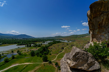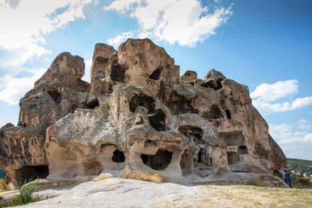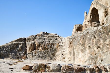 View of Antique cave city with old houses, rocks and grey stones in a sunny day with blue sky. Uplistsikhe old city, Georgia, Europe