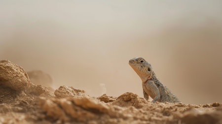 A lizard rests on the sandy ground, focusing on its surroundings while dust swirls in the air