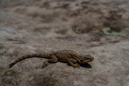 A selective focus shot of a cute Agama hanging out on a rock formation