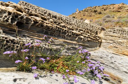 Spring vegetation on the rocky coast of Paros island. Cyclades, Greece