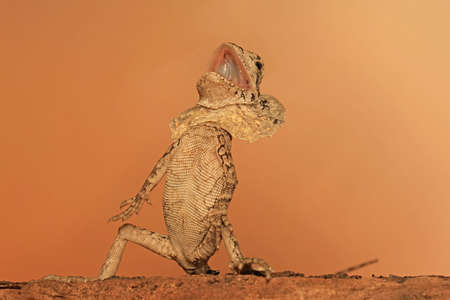 The frilled dragon baby (Chlamydosaurus kingii) is showing aggressive behavior.