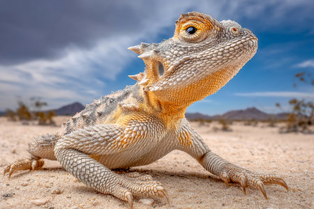 This close-up image captures a distinctive horned lizard resting on sandy ground. Its intricate textures, vibrant colors, and unique features highlight its adaptation to a desert habitat.