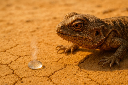 A lizard looks at an evaporating drop of water in the desert