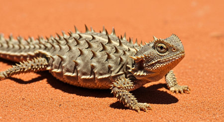 A horned lizard camouflaged in the desert sand, with its spiky appearance and keen eyes, demonstrating the defensive mechanisms of reptiles.
