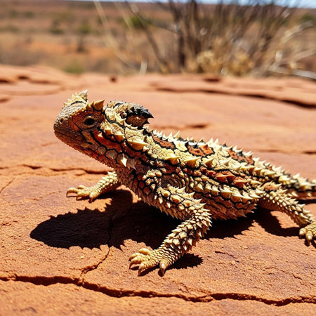 A detailed, low-angle photograph of the spiky, camouflaged lizard in its native, arid, red-orange desert environment.