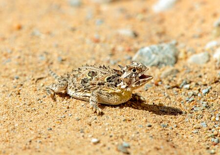 A horned lizard presents a fascinating display, flattening its body against the warm desert sand. Surrounded by scattered rocks, it blends seamlessly into its arid habitat.