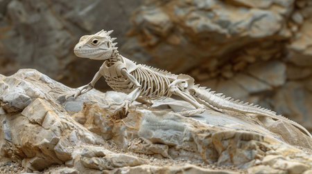 A lizard's detailed skeleton rests on rocky terrain, highlighting its unique anatomy