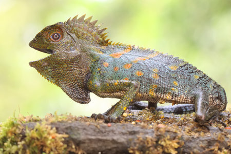 Body gesture of a forest dragon who is ready to attack the intruding animals that enter its territory. This reptile has the scientific name Gonocephalus chamaeleontinus.