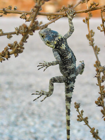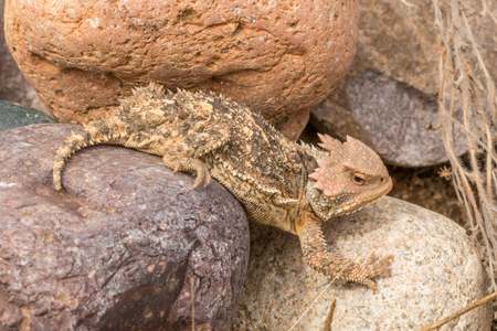 Horned lizard climbing along dry rocks