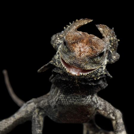Close-up Frill-necked lizard attack, also known as the frilled lizard, Chlamydosaurus kingii, on isolated Black Background, profiel view