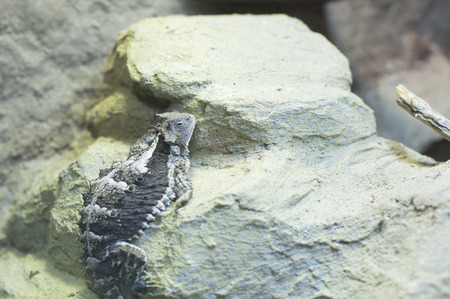 Close-up of australian water dragon on its habitat on land. Beautiful tuatara in zoo or terrarium. Exotic tropical animals concept.