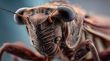 Detailed macro shot of a giant water bug, showcasing its intricate features and textures against a dark backdrop.