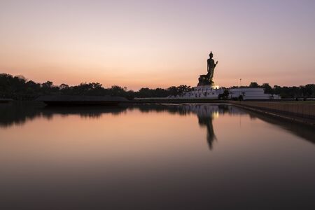 Walking Buddha statue at Buddhamonthon (Phutthamonthon), Buddhist Park in Nakhon Pathom, Thailand, in twilight moment