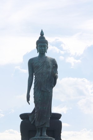 Buddha statue standing on the left hand with blue sky background,Buddha statue Thailand