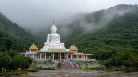 Discover a serene white Buddha statue nestled against lush green mountains and misty clouds, creating a peaceful atmosphere ideal for reflection and exploration.
