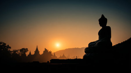 A captivating silhouette of a Buddha statue at sunset, surrounded by mountains and temples. This serene scene evokes a sense of peace, spirituality, and mindfulness.